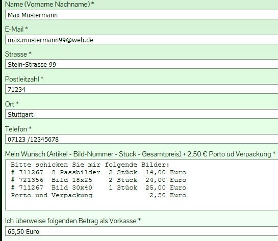 Bitte schreiben Sie Ihre Bestellung in die Felder: | Beispiel: